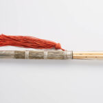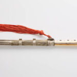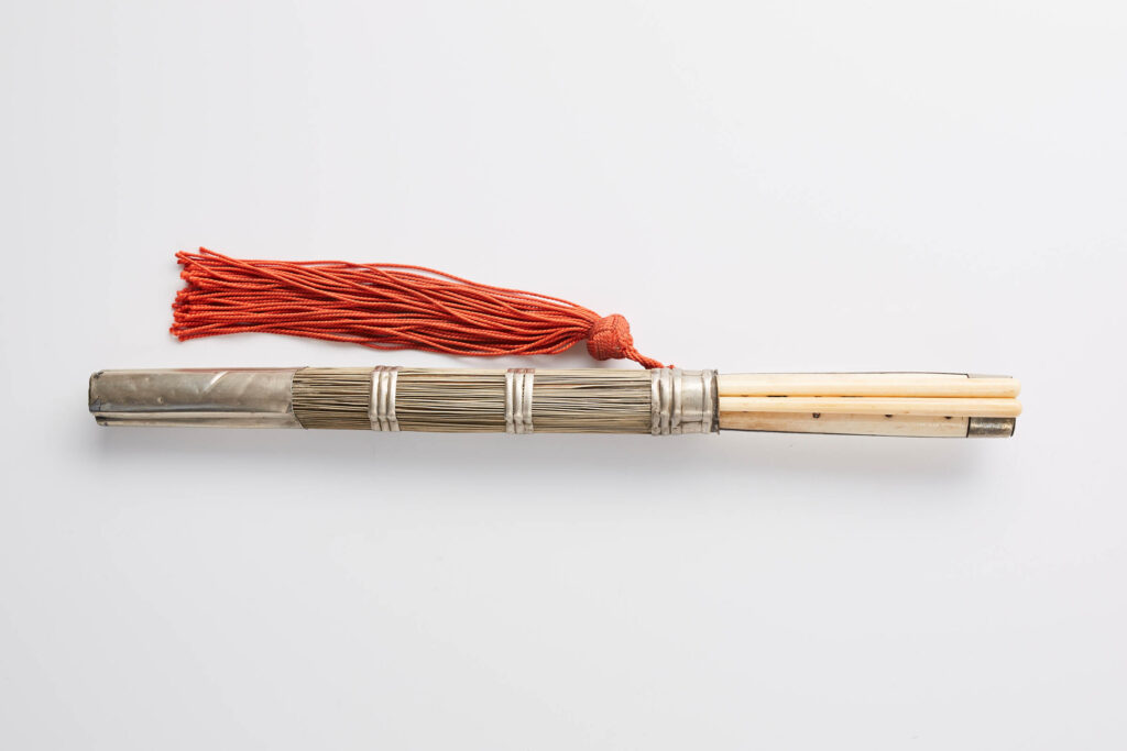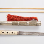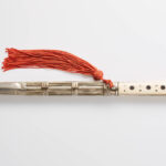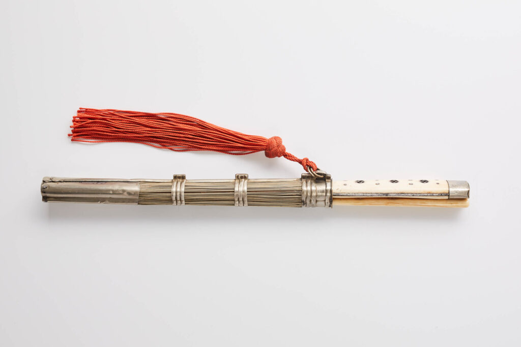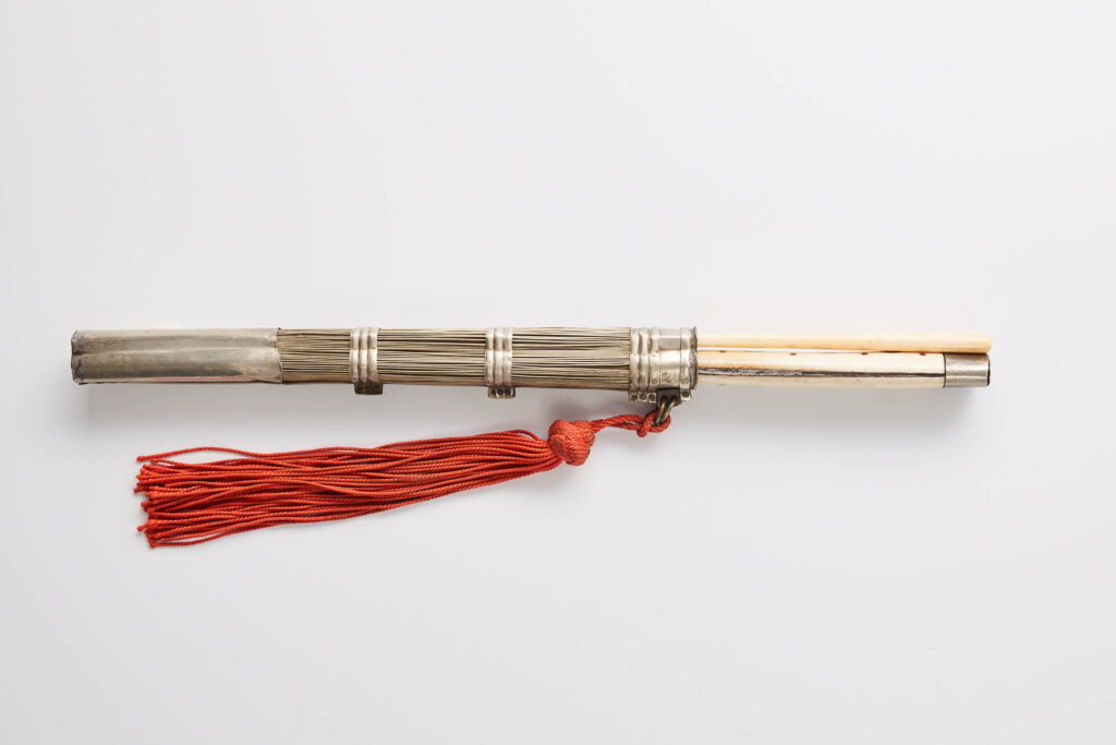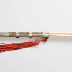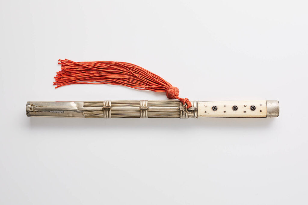 The quiver is covered with silver wires all around it. Plain silver ferrules, handle caps and cuffs further reinforce the quiver. On the back of the quiver, there is a long silver fitting. Two brass rings are attached to the fitting and a red silk tassel is tied to them.