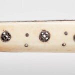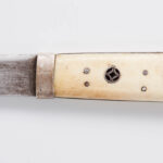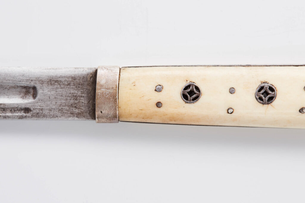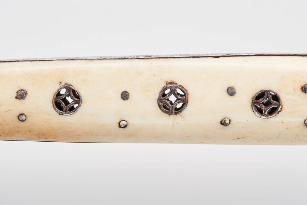 The hilt of the knife is made of ivory. In three places it is pierced by a geometric design of silver inlay. Additionally, four pairs of iron pins are inserted into the hilt.