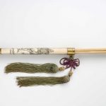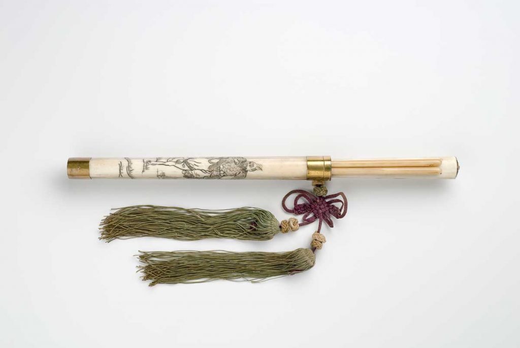 The quiver is made of engraved, black dyed dentine. It shows a bearded rider with a whip in his right hand on his horse. Depth of space is evoked by suggested grassy ground. The ferrule and the handle cap are made of brass, a purple silk ribbon is braided into an endless knot on an iron ring. The endless knot runs over two yellowish knotted rings each into green silk tassel.