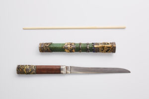 The eating set consists of a quiver containing a knife and a pair of chopsticks.